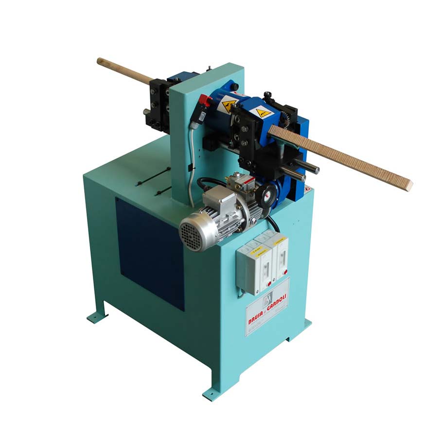 Trafila automatica per la produzione in piccole serie di bastoni tondi DIRITTI in legno , con diametri da 6 a 30 mm.; questa unità utilizza utensili con diametro fisso, da sostituire ad ogni differente diametro; tuttavia se corredata di specifico equipaggiamento, permette anche di ottenere bastoncini con striature elicoidali fino al diametro 18 mm., per la produzione di spine per mobili e serramenti